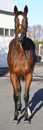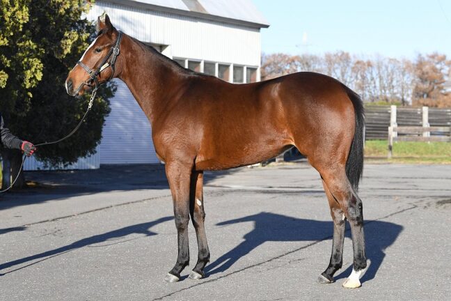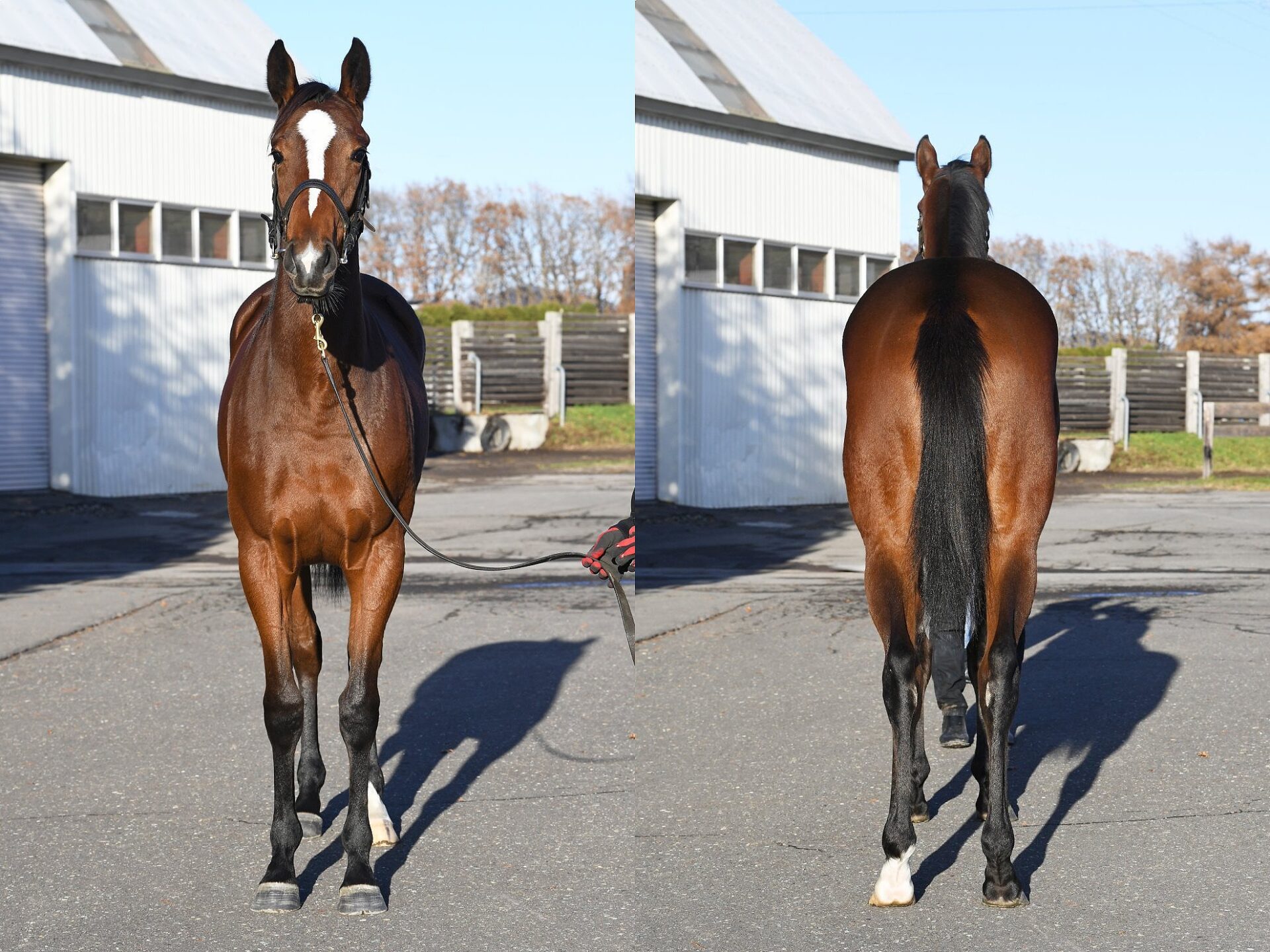 千歳市のチャンピオンズファーム千歳に隣接するウイニングスタッド千歳にて、屋内外のトラックコース2000mのハッキングと屋外坂路1本を18秒ペースのキャンター調教を行なっています。場長は「調教ではキビキビ動いてくれるし、何も不安がなく騎乗運動が行なえています。身体はまだ小さめですが、その分、反応が速くて軽い俊敏性を感じさせます。これから力が付いて、走りに力強さが出てくるでしょう」と評しています。測尺は体高156cm・胸囲180cm・管囲19cm、馬体重は412kgです。なお、本馬の父キタサンブラックの産駒ゴーラッキーが2歳新馬(11月30日・東京6R・芝1800m)で、オディロンが園田金盃(重賞・11月27日・園田12R・D1870m)で優勝し、ガイアフォースがマイルチャンピオンS(G1・11月23日・京都11R・芝1600m)で2着に健闘しました。また、本馬を管理予定の栗東トレセン・上村厩舎所属グレースジェンヌが2歳新馬(11月15日・京都5R・芝1600m)で、アクセスが2歳新馬(11月16日・京都5R・芝2000m)で優勝しました。