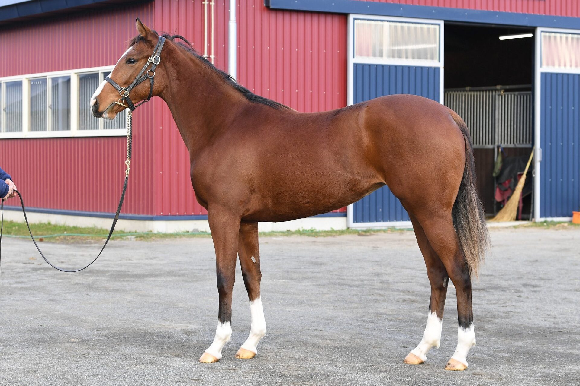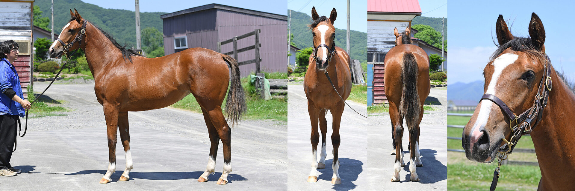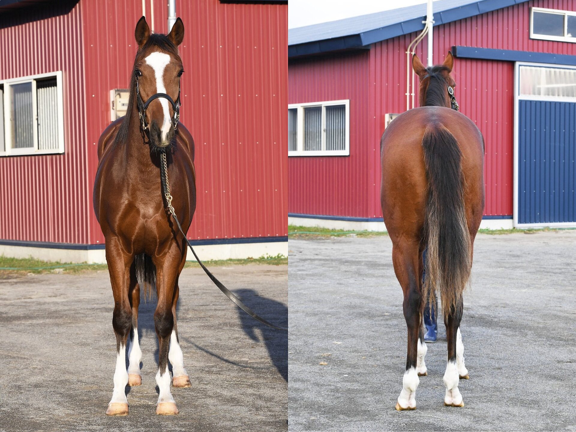 浦河町の吉澤ステーブルにて騎乗馴致を終え、ロンギ場内でのダクとハッキング運動を行なっています。場長によると「こちらへ移動してしばらくは環境に慣れて落ち着くための期間を設け、それから馴致メニューへ進めました。状況の理解力もあり、ハミ馴致、ロンジング運動、ウォーキングマシン運動、ドライビング運動などで人の指示への理解やフットワークの理解を促しましたが、とても順調でした。精神面の成長度合いに合わせて騎乗運動に移行してからも大きく取り乱す事はなく、人が背中に跨る事をすんなりと受け入れてくれました。今後は場内のトラックコースでの集団調教に移行して、一層の成長を図ります」との事です。測尺は体高154cm・胸囲177cm・管囲19cm、馬体重は452kgです。