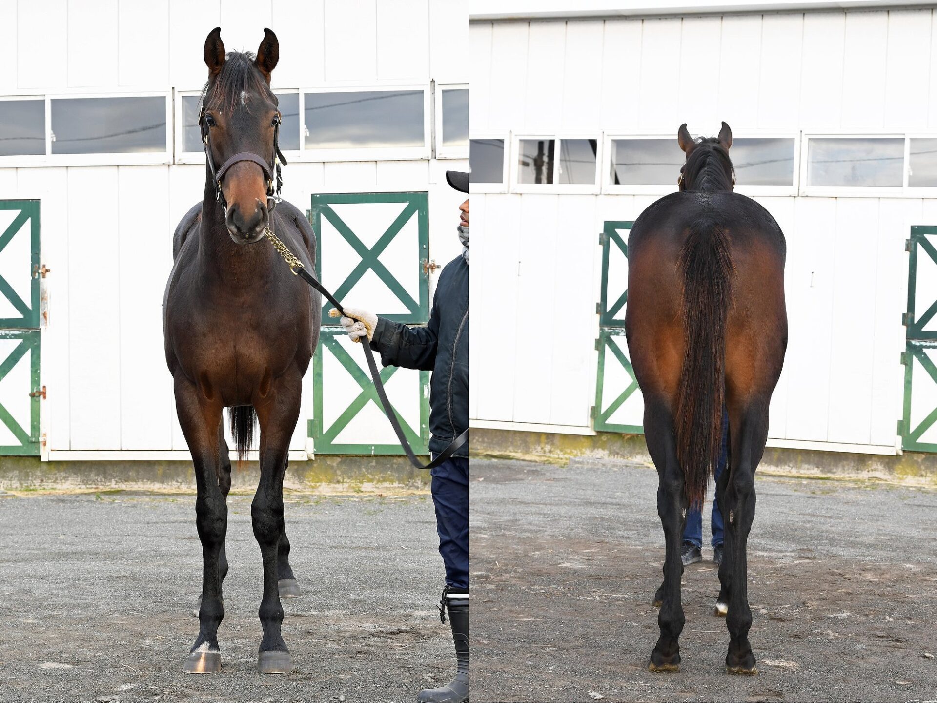 新冠町の福地トレーニングファームにて、屋内ダートコース1800mをハッキングキャンターの調教を行なっています。代表は「気性面に幼さがあったので、時間をかけて馴致を行ないました。騎乗馴致完了後はトラックコースで軽く乗って、施設などの環境に慣らしています。普段は幼い動きが多いけど、騎乗すると従順になっているので、間もなく坂路調教に進む事ができるでしょう」と話しています。測尺は体高158cm(±0)・胸囲182cm(+2)・管囲20.5cm、馬体重は472kg(±2)です。なお、本馬を管理予定の美浦トレセン・和田(郎)厩舎所属カフェラバーが2歳新馬(11月24日・東京7R・芝1400m)で優勝しました。