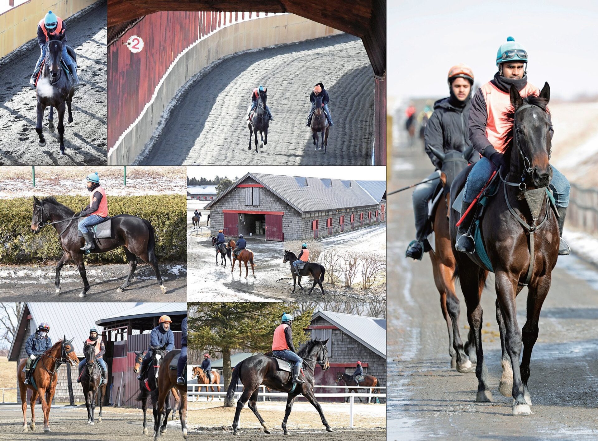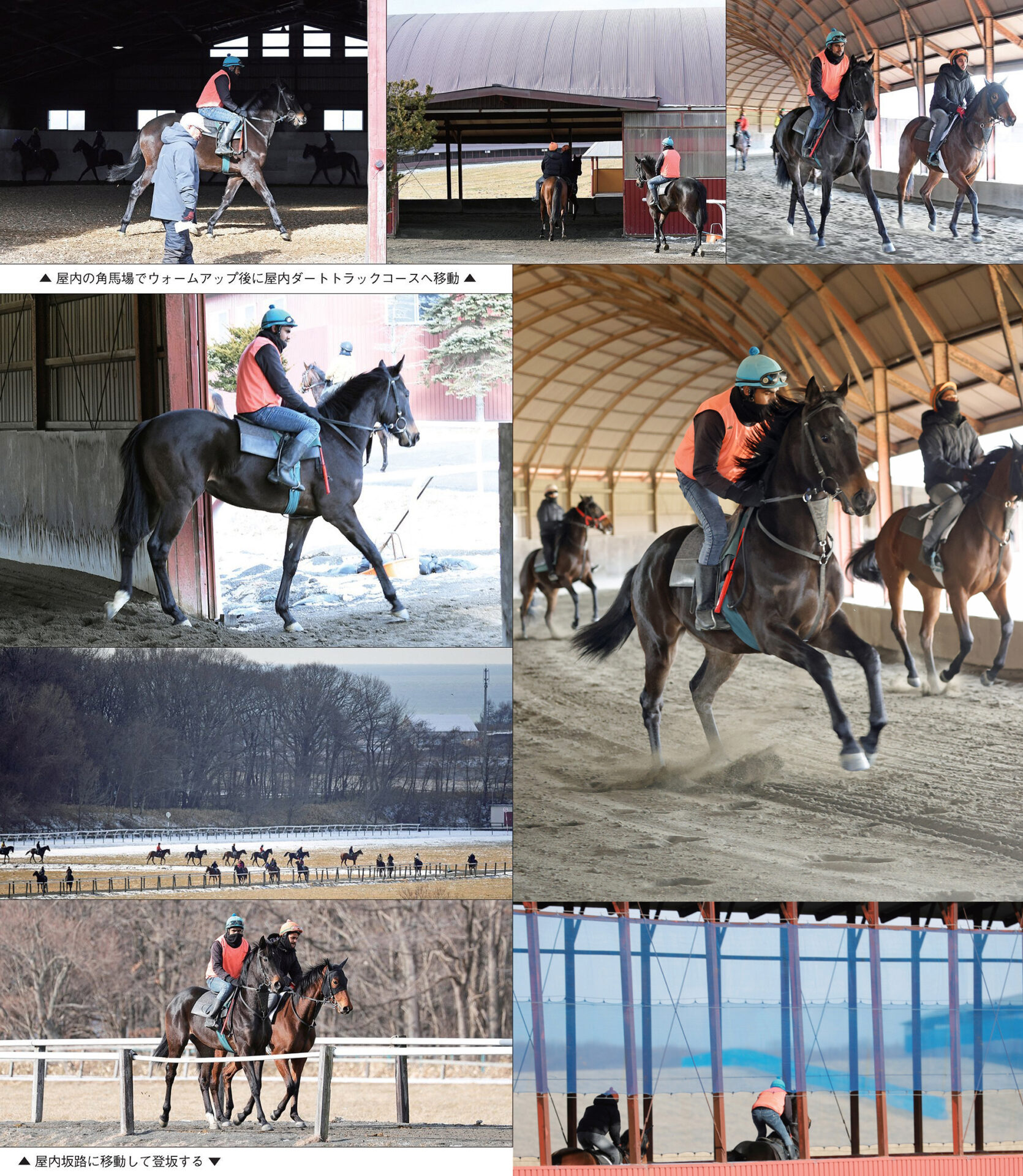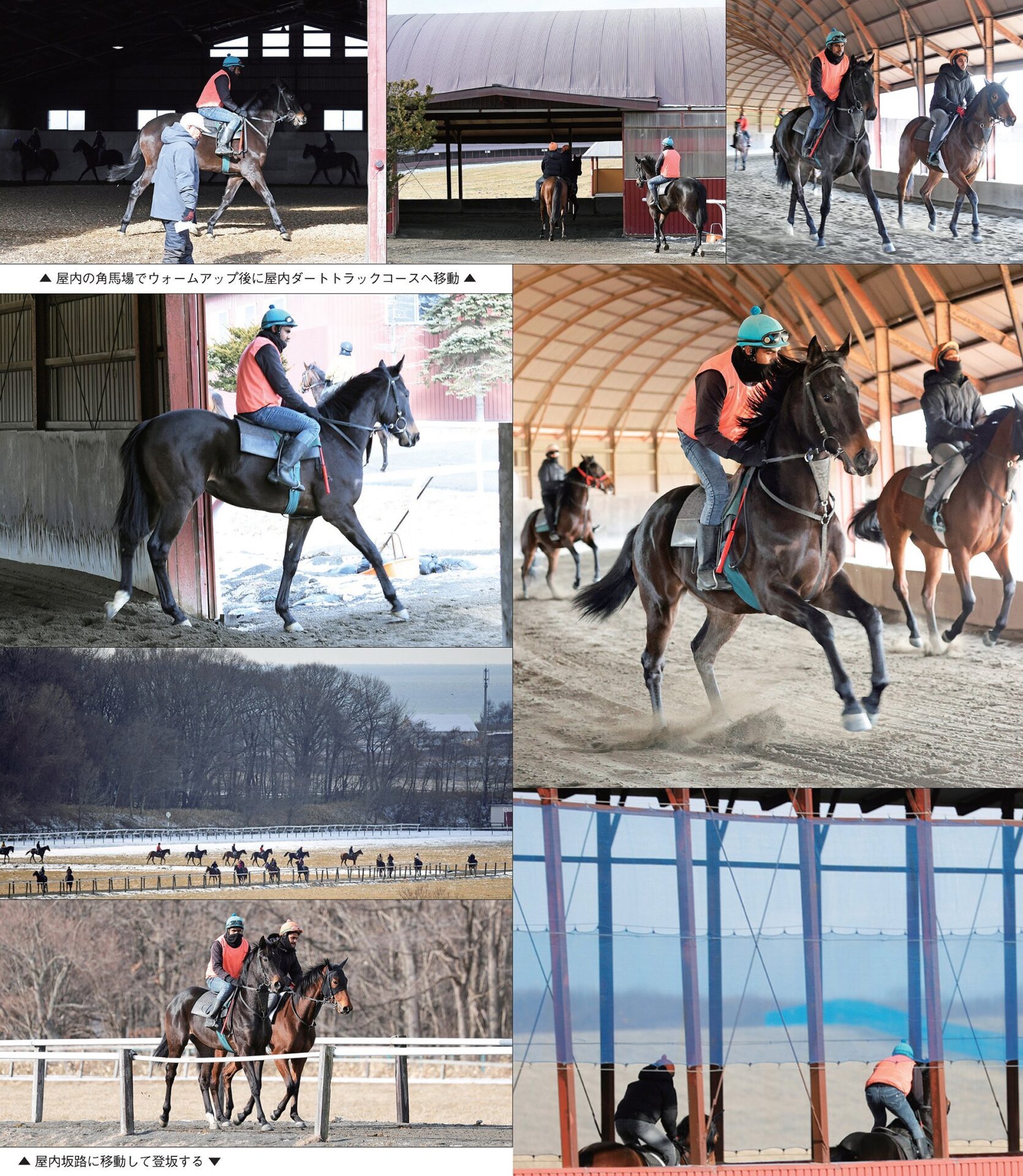 さて、取材当日のメニューは、屋内角馬場でウォーミングアップののち、屋内800mダートコースを2周半。そして、全長800mの屋根付きダート坂路を1本というもの。ハロン17秒程度を目安にしているというが「馬に力が付いてくるから、今の時期はどうしても予定より速くなります。15秒を切る必要がないから17秒」という指示はベテラントレーナーである場長ならではだ。冬期間は馬場凍結のために使えないコースも多いが、後條場長はそれでも工夫しながら「毎日違うメニューを課している」という。