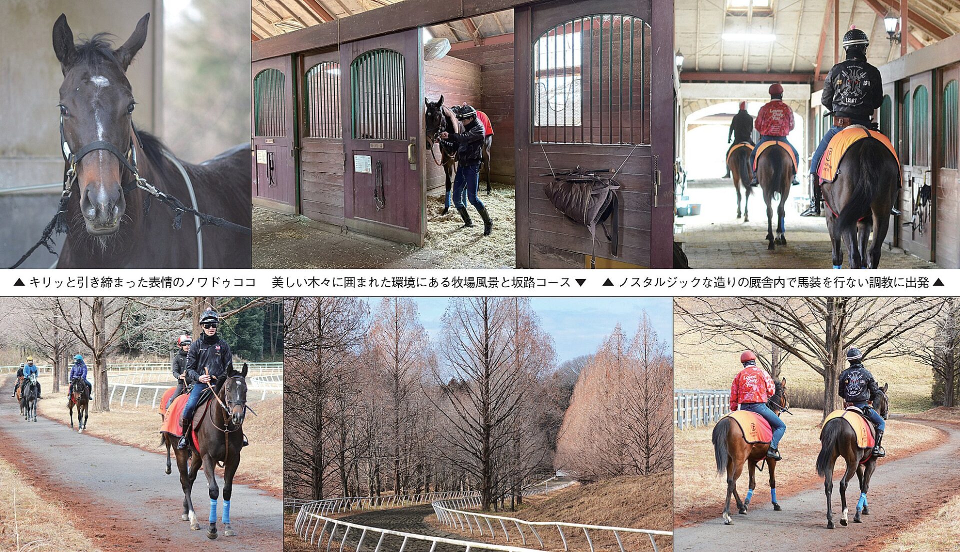 やがて屋外ダートコースに入るとダクで半周し、坂路コースへ向かう。久杉厩舎長に、坂路全体を見渡せる丘へ案内していただくと、美しいシルエットの木々に囲まれた絵のような風景が目に飛び込んでくる。久杉厩舎長が「今日は坂路2本です。2歳馬ばかりで上がってきますよ。ここは勾配がきつくてダートも深い。馬にとってはかなり負荷がかかるコースです」と教えてくれた。