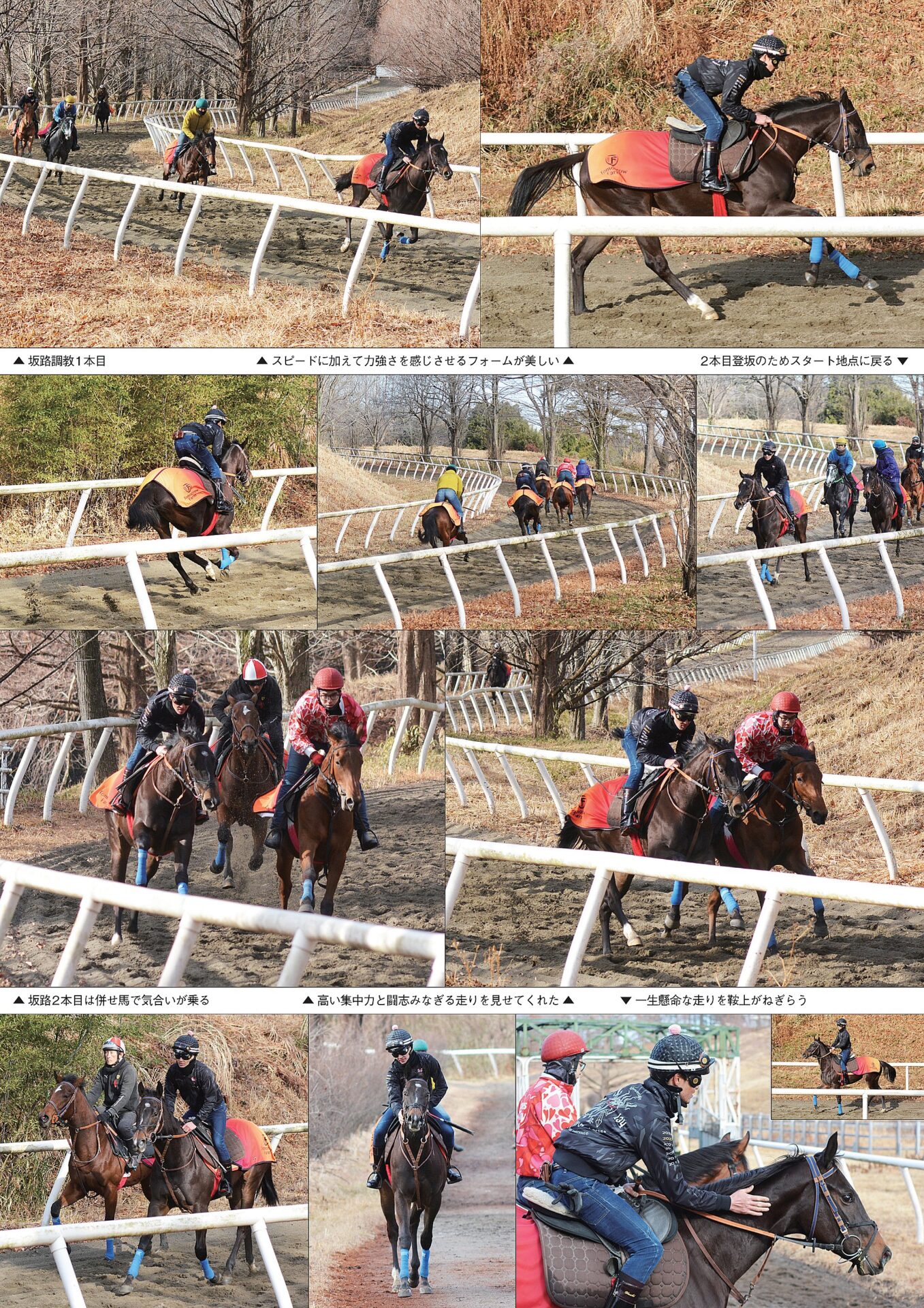 登坂が始まり、久杉厩舎長の「3番手ですね」との説明直後、ザデイ24が目の前を駆け上がっていった。スピードに加えて力強さを同時に感じさせるフォームが美しく、思わず見惚れてしまう。1本目を終え、ダクで下りていく姿にも余裕があり、まだまだ走りたいと言っているような集中した顔つきを見せた。そして2本目は先頭でスタート。コーナー部分では首を進行方向へしっかり向け、目つきが鋭い。同じ2歳馬ながら、併走する仲間たちとは明らかに違う集中力と、闘志すらも感じさせる走りを見せた。