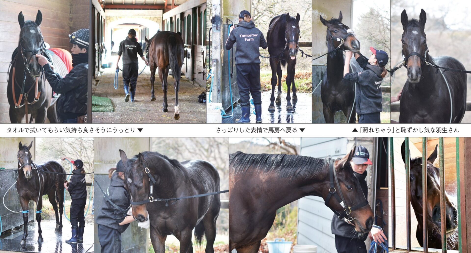 坂路を上り終えると、馬場横の森林馬道へ入り、蹄の音を響かせながら先頭で歩いて戻ってきた。堂々とした雰囲気を漂わせ、自然と目を引く存在感がある。鞍上がねぎらって首を撫でると、なんだか得意げな表情になるのがほほ笑ましい。久杉厩舎長は「終い15-15で3ハロン46秒。良い動きでした。自分からハミをとっていますし、今のところ言う事はないです」と満足げに評してくれた。馬装を解かれた本馬は、スタッフの羽生さんの手にゆだねられた。手入れの様子を撮影させていただく事をお願いすると、羽生さんは「照れちゃう」と恥ずかし気に笑い、久杉厩舎長は「彼女は馬への愛情たっぷりですよ」とたたみかける。スタッフ同士に流れる空気も柔らかく暖かいのが印象的だ。羽生さんに連れられて洗い場へ向かった本馬は、ていねいに身体を洗ってもらう間も、実に従順だ。身を任せて穏やかに立ち、タオルで拭いてもらうと、うっとりして目を閉じる様子が実に気持ちよさそうだ。