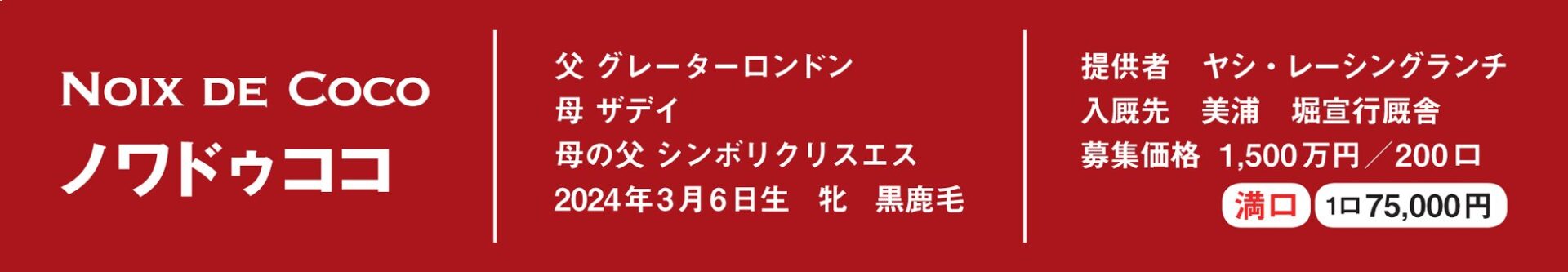 提供者であるヤシ・レーシングランチ社長が本馬に寄せる思いや愛情まですべてを受け継いだトゥモローファームが、手塩にかけてはぐくんでいるザデイ24ことノワドゥココのさらなる成長と活躍が楽しみでならない。